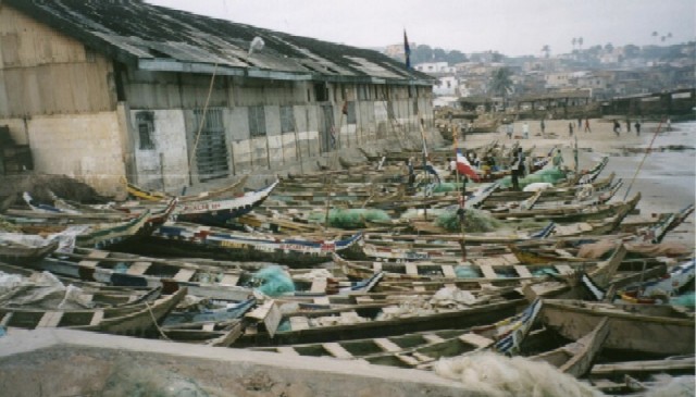 Fischerboote neben dem Fort in Cape Coast. Fishermens´ boats beneath the coastal fortress in Cape Coast.